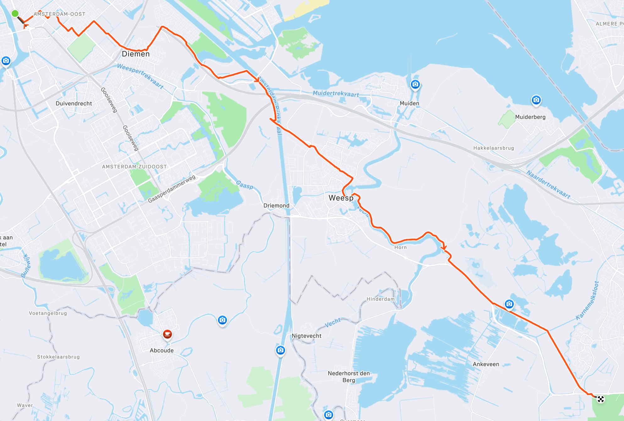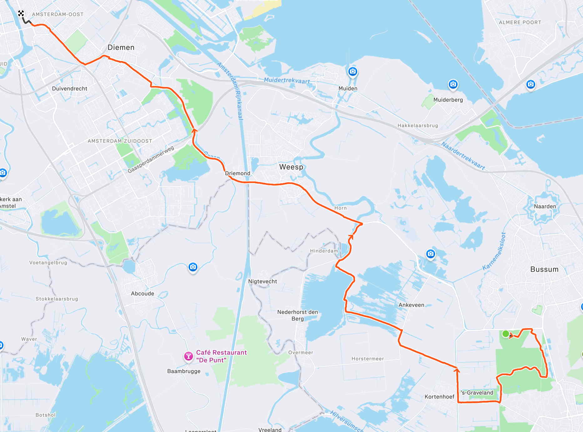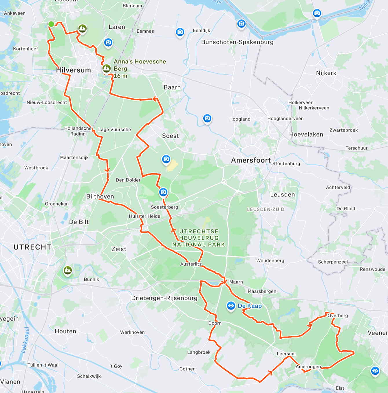 Zaterdag. Beter weer dan verwacht, geen regen, geen bui, in plaats daarvan wel zon door de wolken. Aangename temperatuur, westenwind. Bekende wegen over de Heuvelrug, en wat stukjes die ik niet kende, bij Leersum en Amerongen. Fijne afstand.