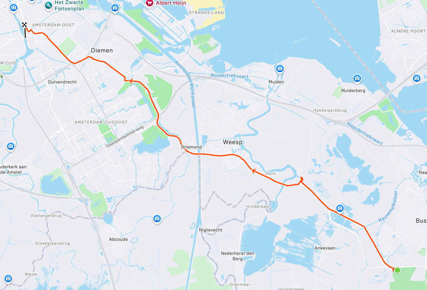 Na een dag werken in Rotterdam toch in de avond naar Fransche Kamp. Met twee volle tassen. Wind in de rug, wel fris. En net voor donker nog een rondje over de Bussumse Heide en door het Spanderswoud.