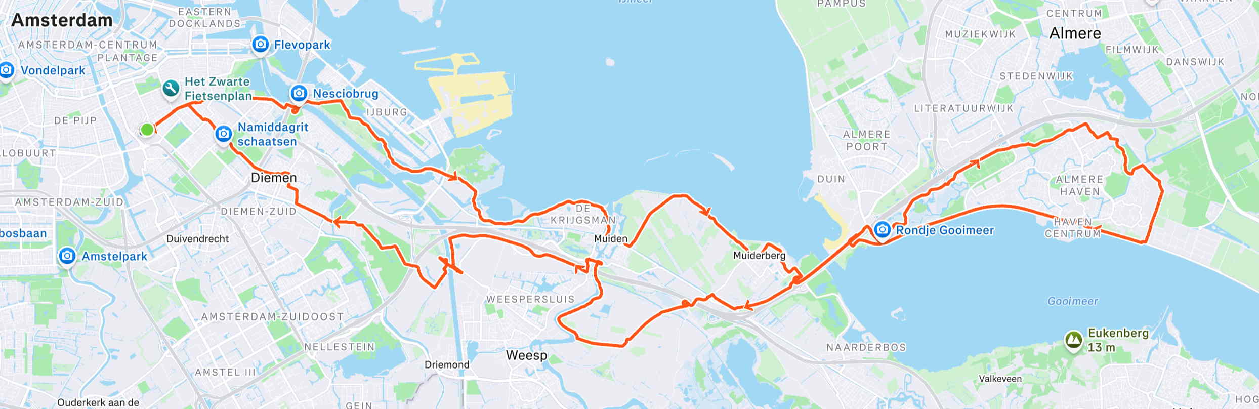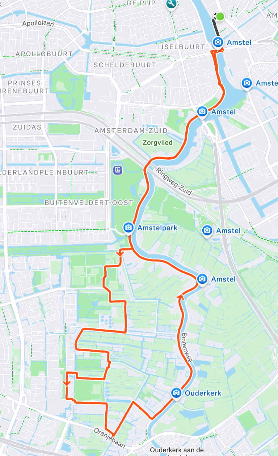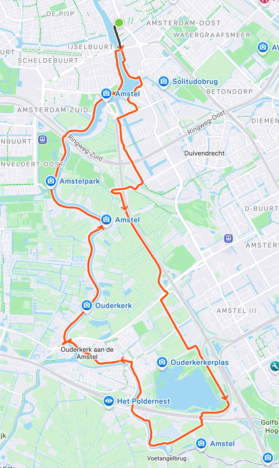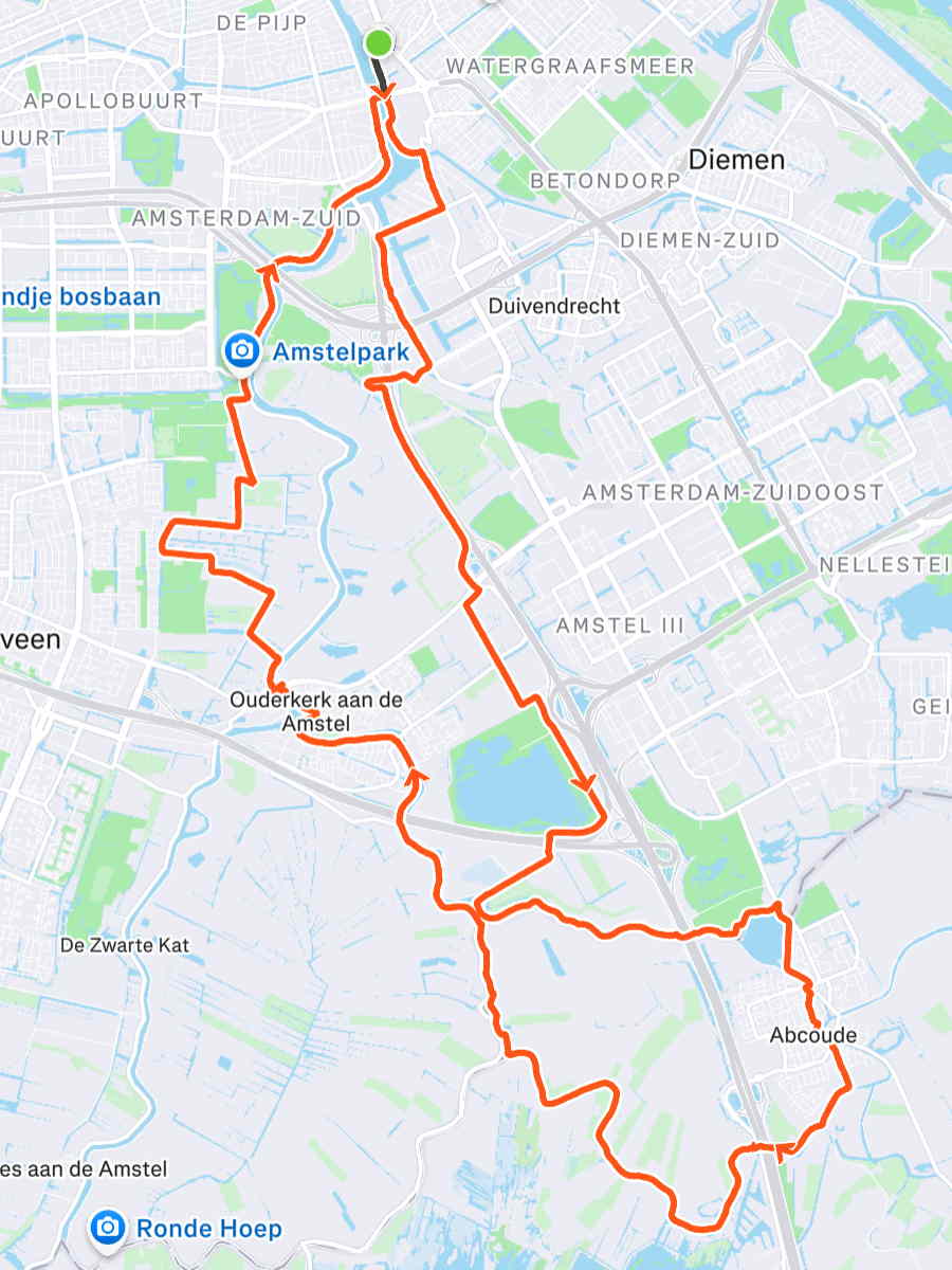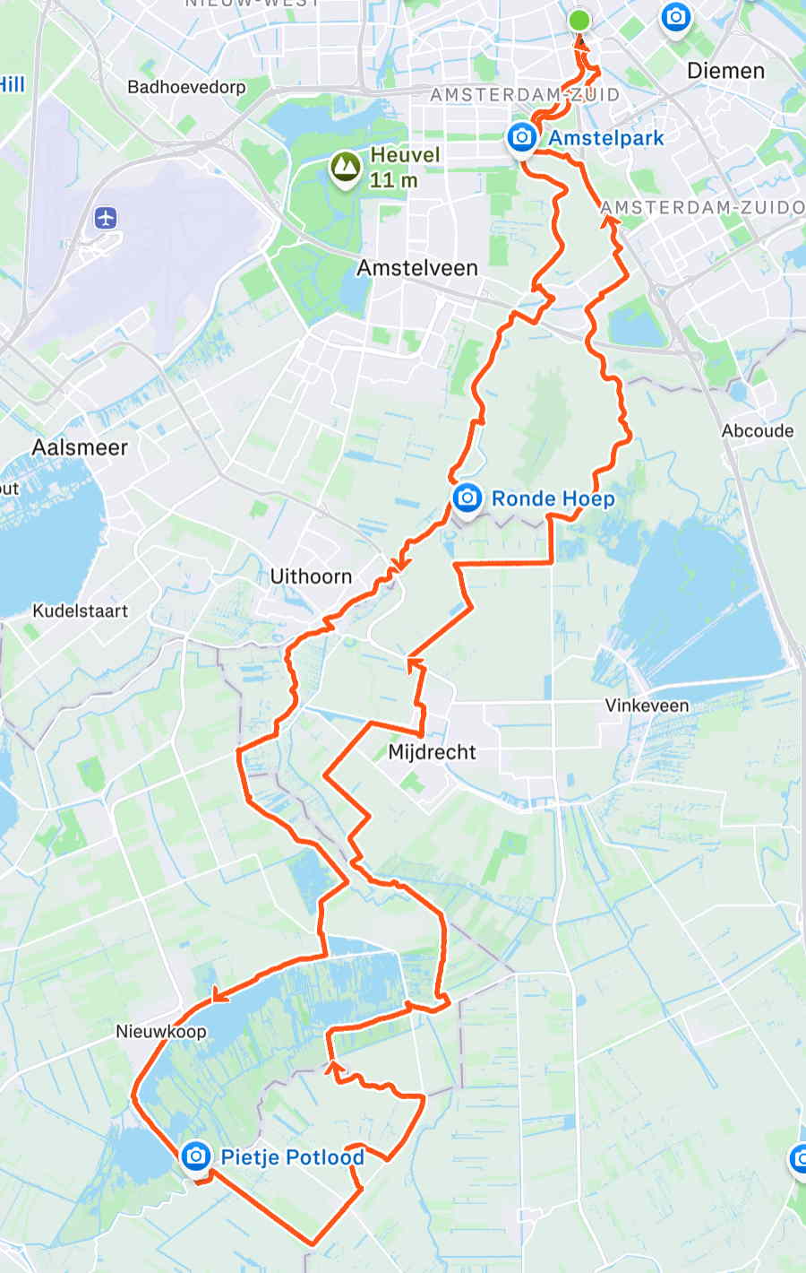 Oliebollenritje. Of oliebolritje, want het was er maar 1. Grijs, soms een beetje lichte regen en noordwestenwind. Lekker naar buiten, knap je van op. Nog eens Amsterdamse Bos, Schinkelbos, Aalsmeer, Bovenkerkerpolder, Amstelveen en terug naar het Amsterdamse Bos.
